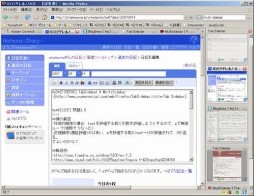 Tab Sidebar こんな風に、タブのサムネイルをサイドバーに表示してくれる拡張。僕の場合、いつの間にかよくわからないタブ(特にGoogleの検索結果)が増えていくので、いらないタブをべしべし消していくのには便利。 MultiSidebar | Firefox Add-ons | Mozil…
